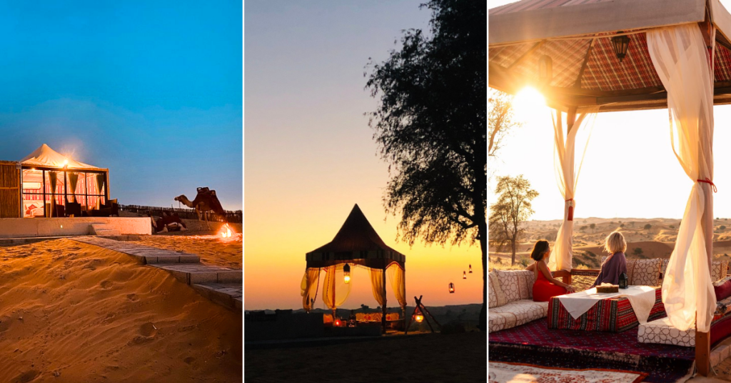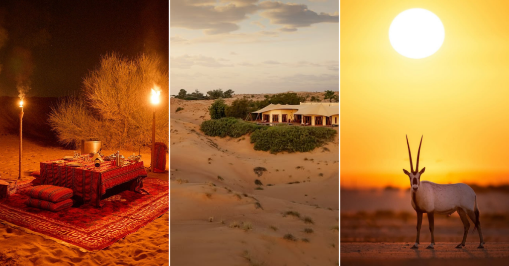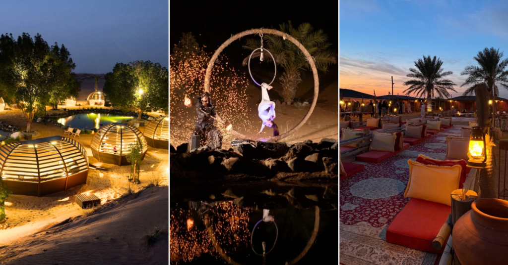 Set in Sharjah’s rugged landscape, Mleiha is perfect for those who want something adventurous and raw. Guests enjoy safaris, cultural shows, and stargazing setups away from the city lights. Its natural, rocky terrain adds a dramatic backdrop that feels different from Dubai’s softer dunes.